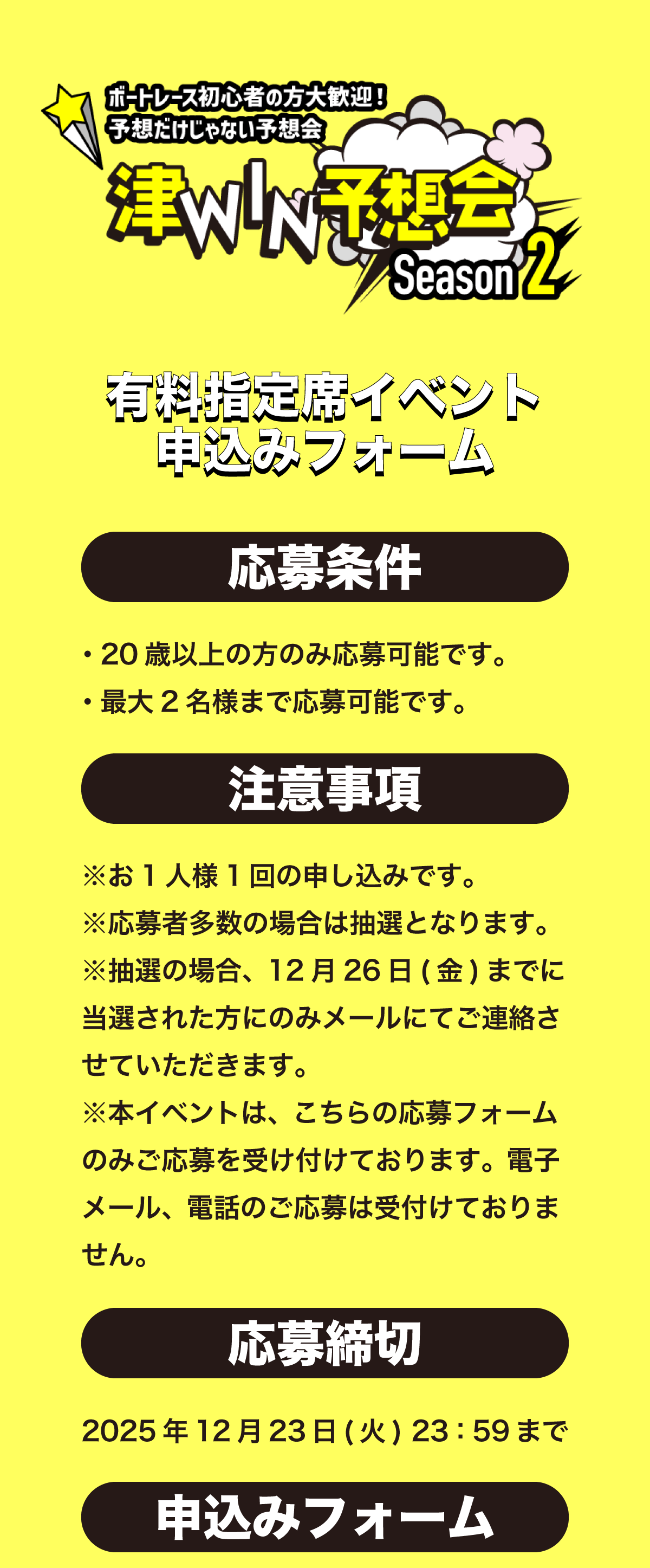 ボートレース津(以下「当事業部」といいます。)が実施する「津WIN予想会Season2 有料指定席イベント」(下記、「本イベント」をいいます。)へ応募を希望される方は、この応募規約
